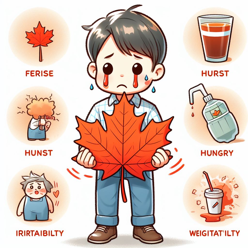 단풍당뇨증은 신생아기에 가장 흔하게 나타나며, 식욕 감퇴, 보챔, 소변에서 특이한 냄새, 발육 부진, 경련, 혼수, 사망 등의 증상이 나타날 수 있습니다.